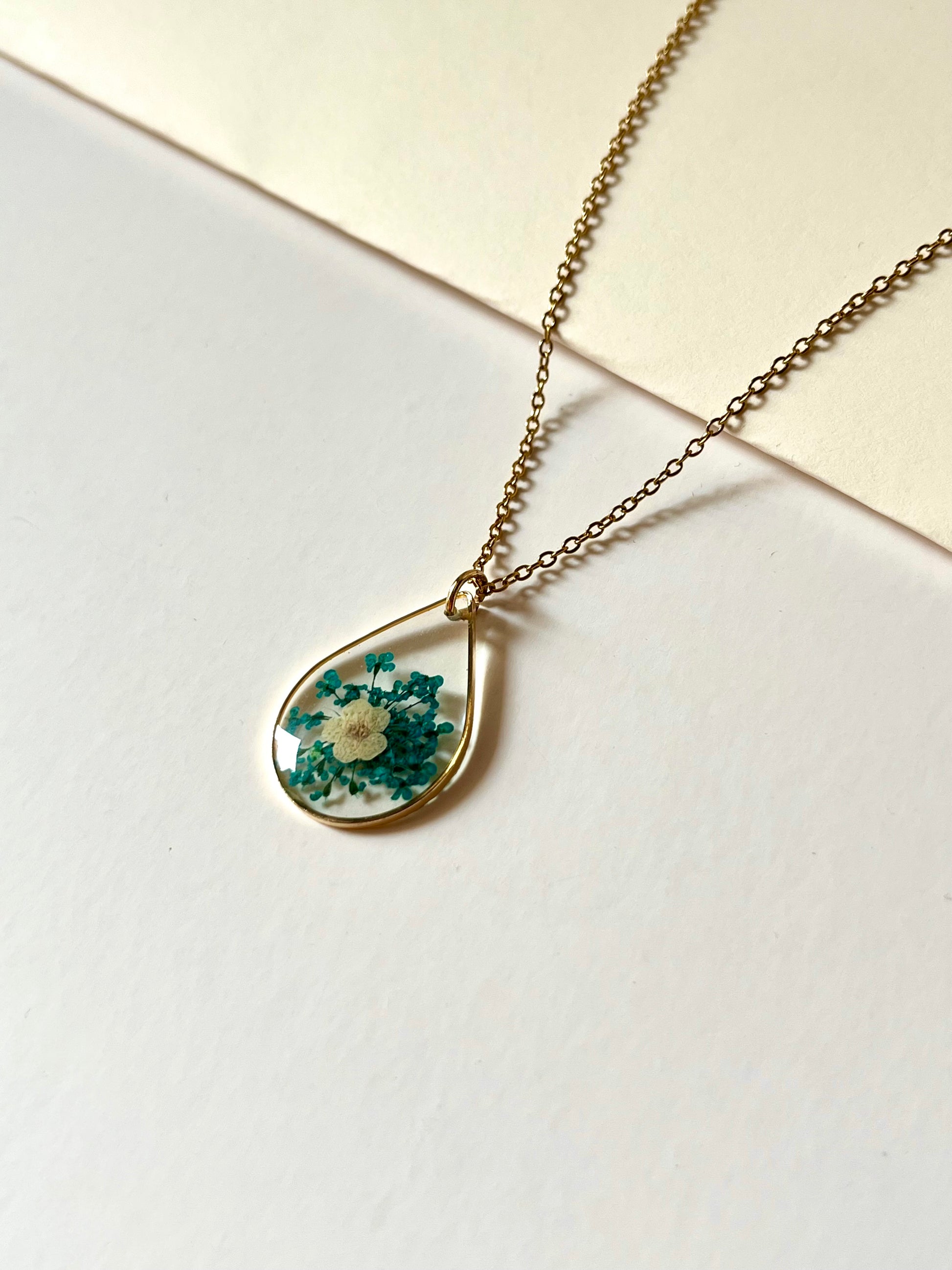 The Aqua Promise Necklace is a symbol of love as deep and enduring as the ocean. The aqua tones reflect calmness, clarity, and loyalty, while the plum flower represents strength and resilience, and Queen Anne’s Lace adds grace and protection.