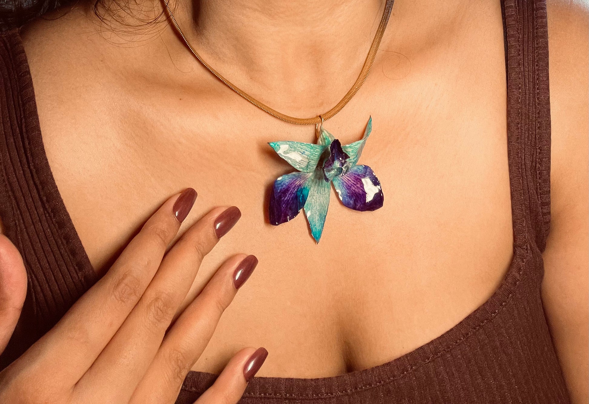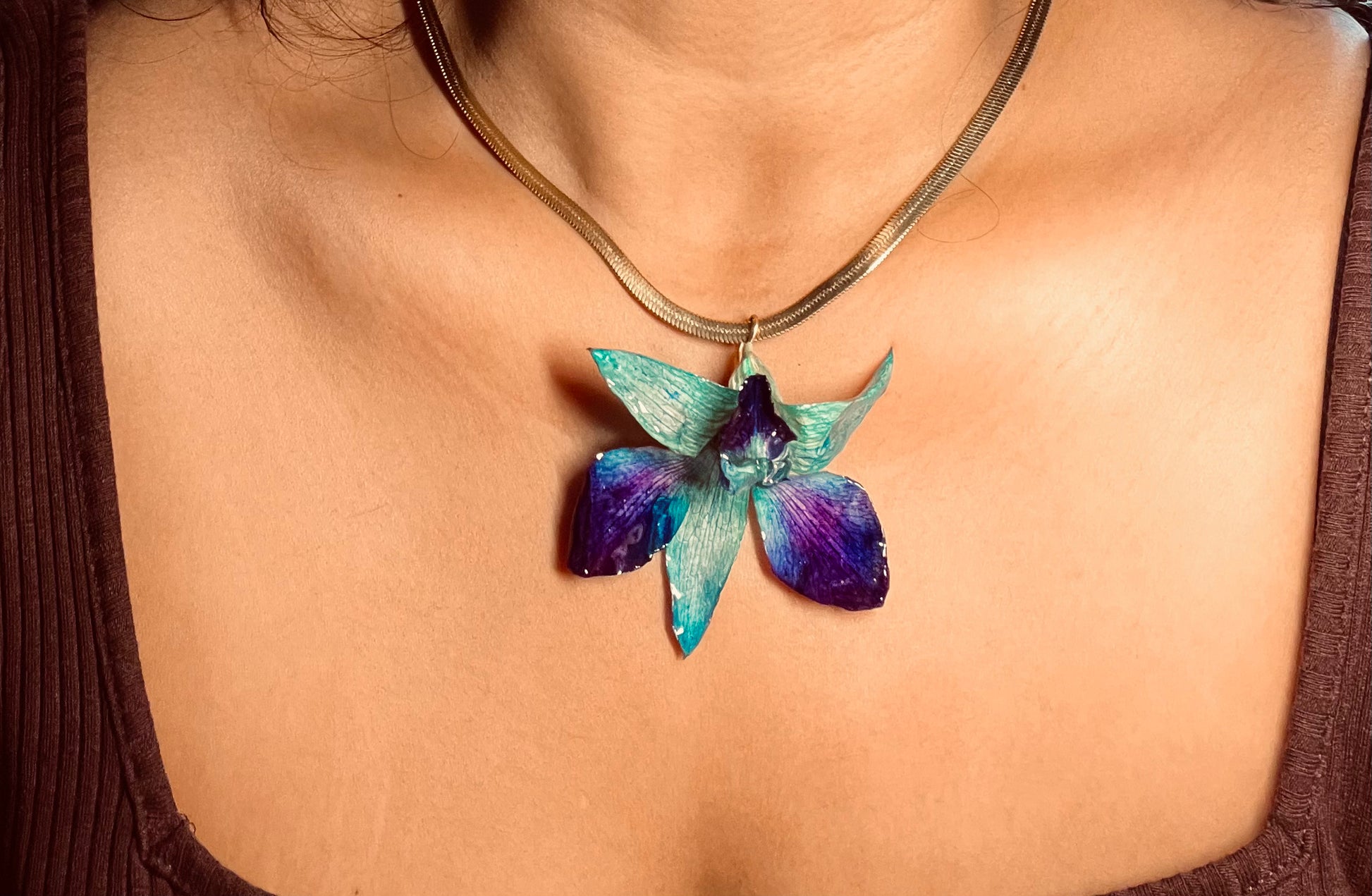 A statement of wild beauty and regal strength — a full real orchid, suspended in crystal-clear resin, anchored by a bold, gold-plated chain. Each petal holds the story of nature’s finest form, transformed into timeless jewellery.